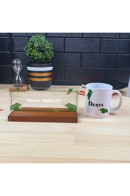 Kişiye Özel Ofis Masa İsimliği ve Kupa Bardak Hediye Seti – Yaprak Desenli