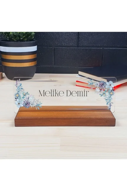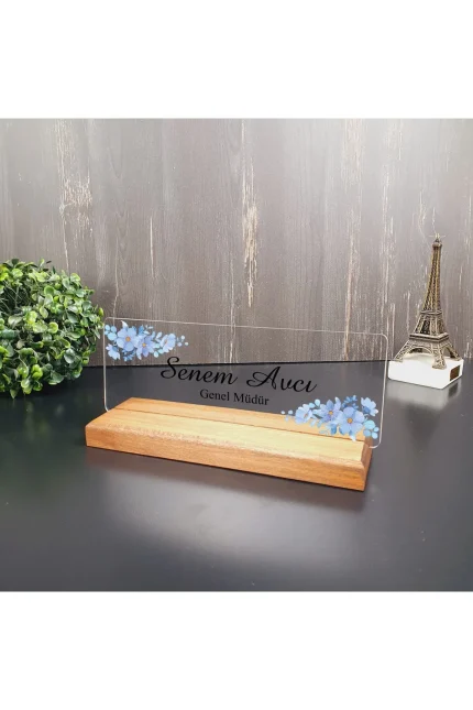 Kişiye Özel Modern Tasarımlı Mavi Çiçekli Masa İsimliği