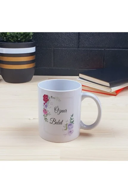 Kişiye Özel Ofis Masa Isimliği Ve Kupa Bardak Hediye Seti – Renkli Çiçek Ve Çerçeve Desenli