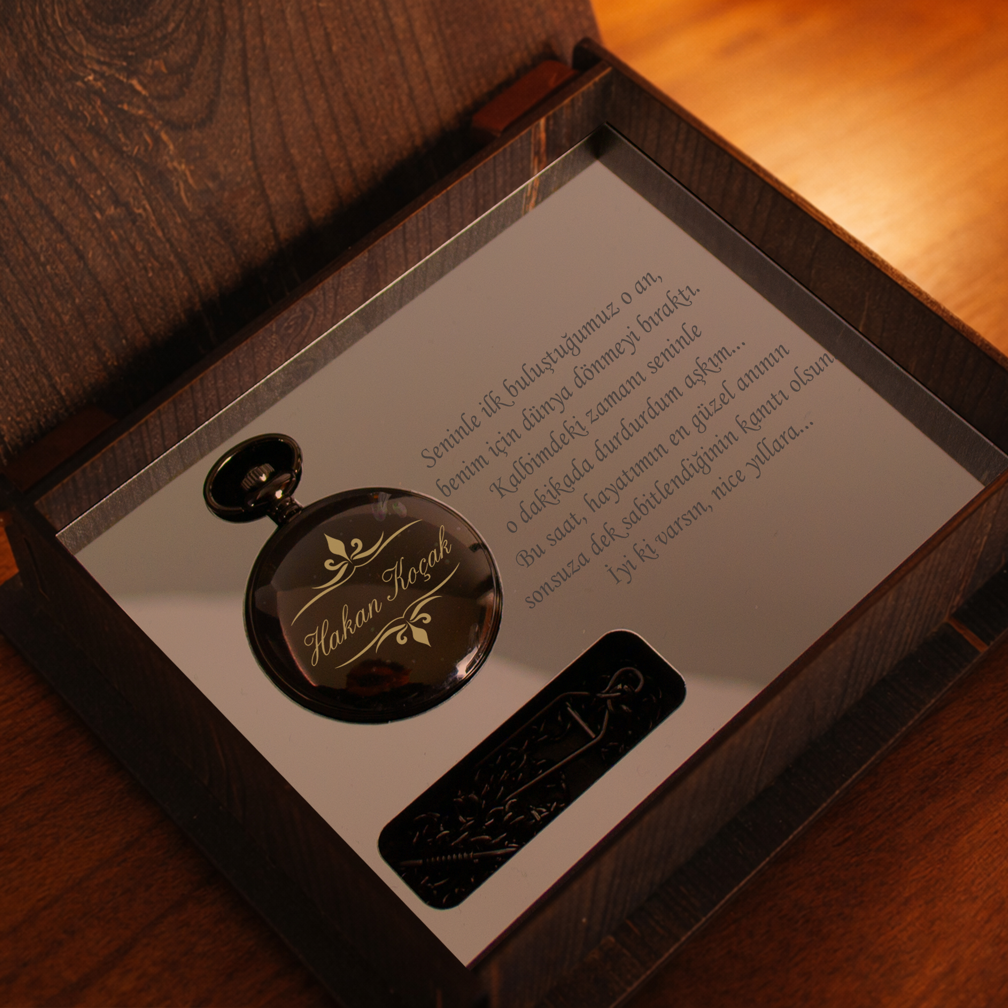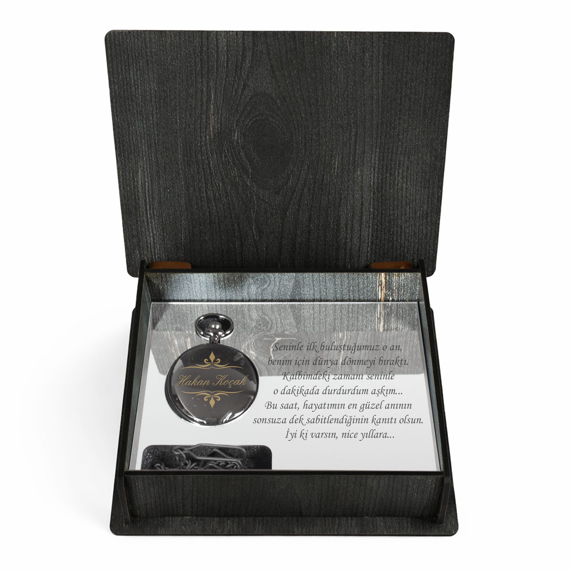 Şıklığı ve anlamlı detayları bir arada sunan kişiye özel cep saati, sevdikleriniz için ömür boyu saklanacak özel bir hatıradır. Ahşap kutusu, içerisine eklenen kalıcı hediye mesajı ve  siyah renk tasarımıyla hem estetik hem de duygusal bir hediye seçeneğidir.