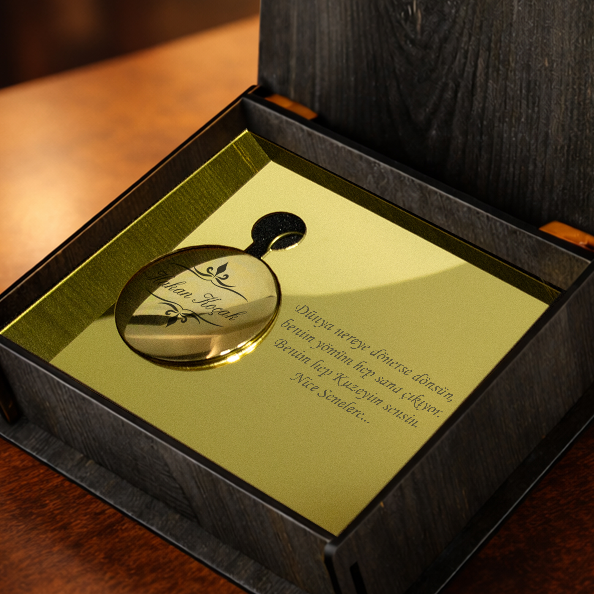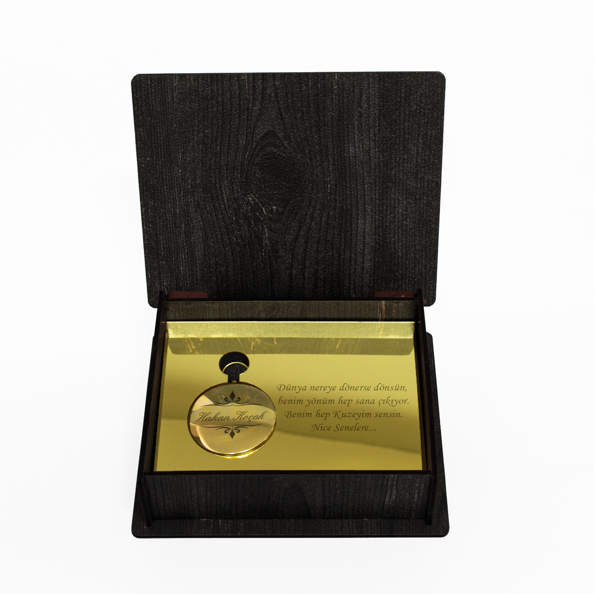 Pusulanın üzerine isim, tarih veya kısa bir mesaj yazdırabilir, tamamen size özel bir hediye oluşturabilirsiniz. Şık ahşap kutusu sayesinde hem koruma sağlar hem de hediyenize premium bir görünüm kazandırır.