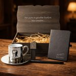 Kişiye özel tasarlanan fincan, anahtarlık, kalem, defter ve şık ahşap kutudan oluşan premium hediye seti, özel günler için mükemmel bir seçimdir.