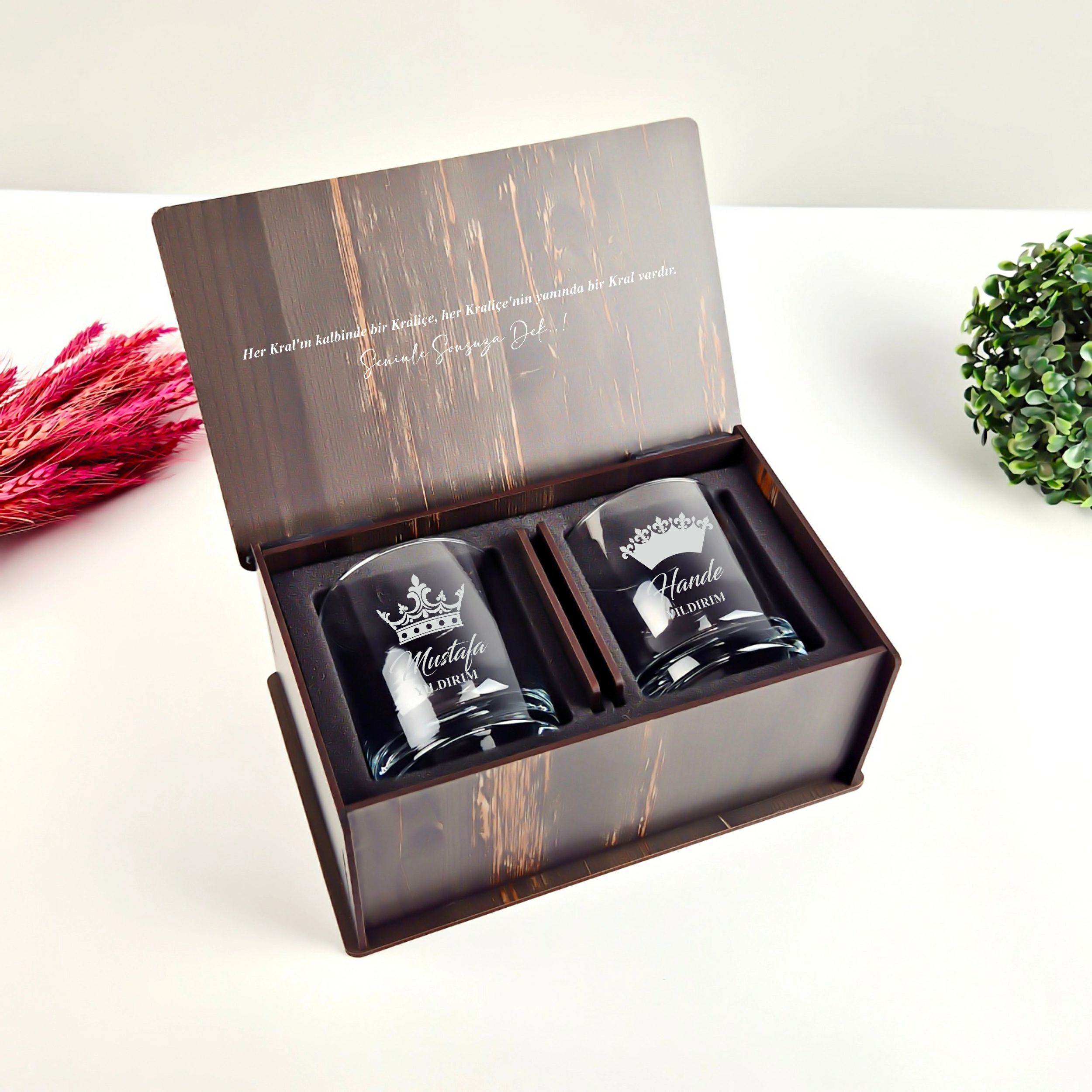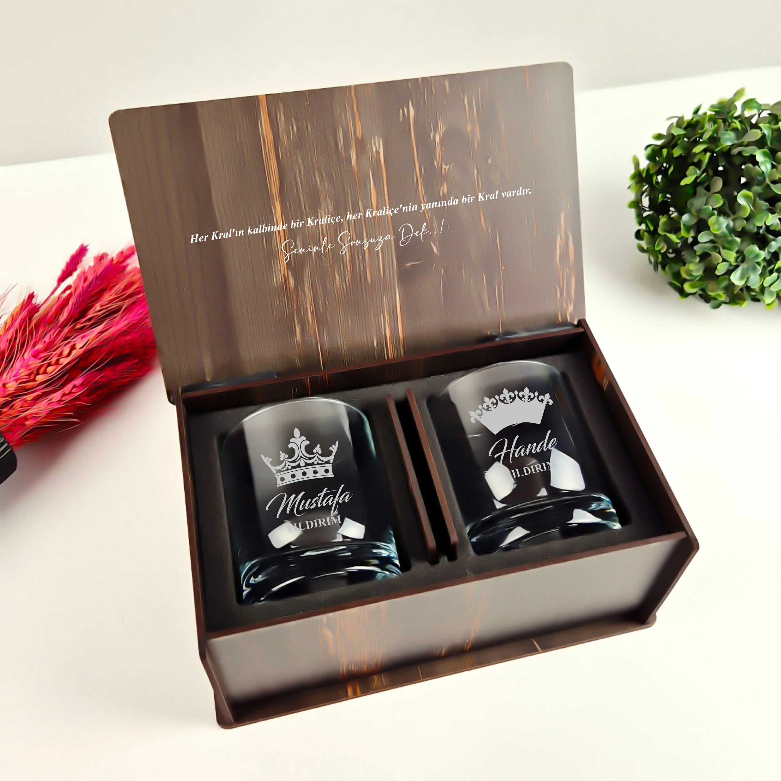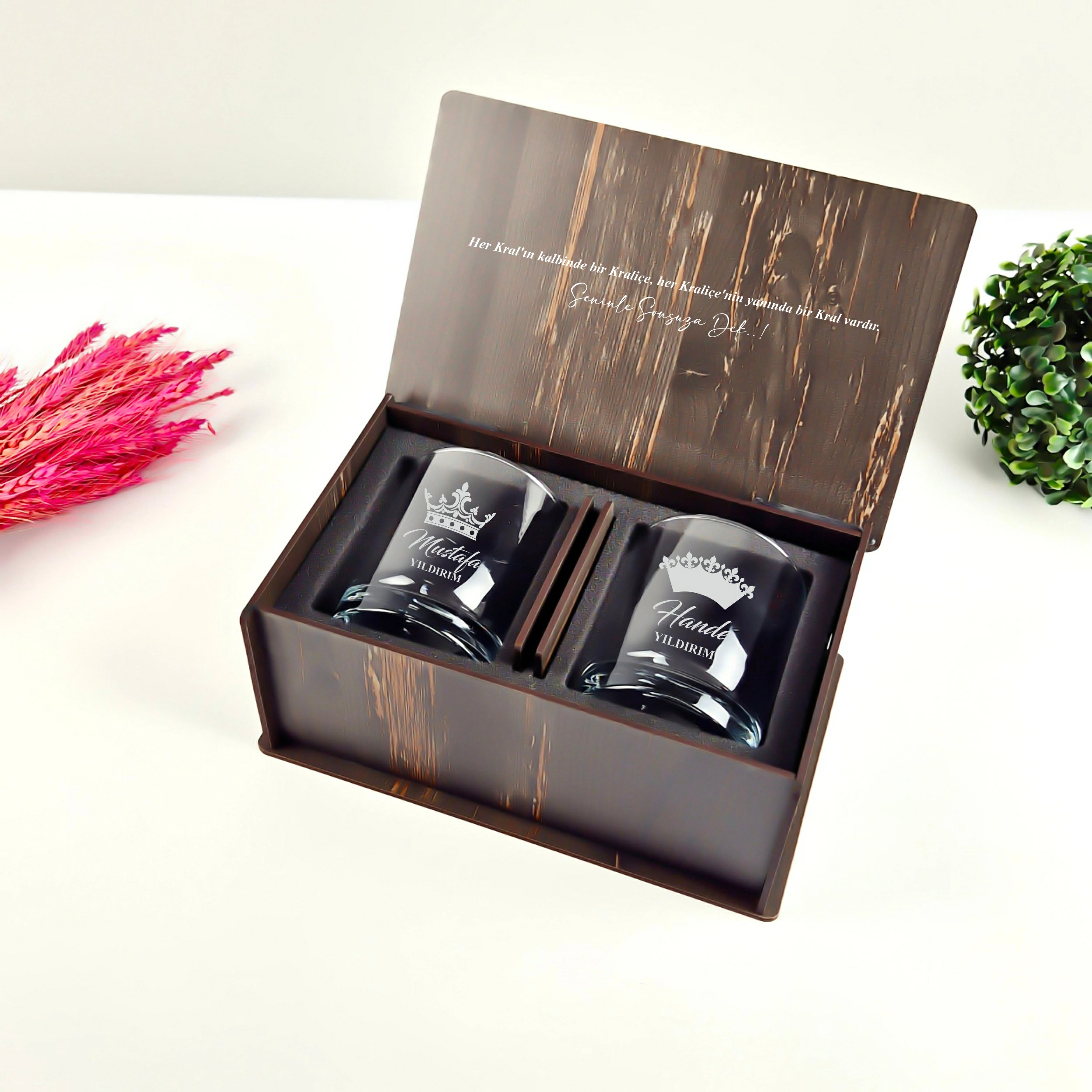 Sevdiklerinize hem şık hem de anlamlı bir hediye arıyorsanız, bu özel tasarım viski bardağı seti tam size göre! Kral ve Kraliçe taç desenleriyle süslenmiş, isim yazılabilir 2’li viski bardağı seti, ahşap kutusu ve bardak altlıklarıyla birlikte özel bir deneyim sunar.