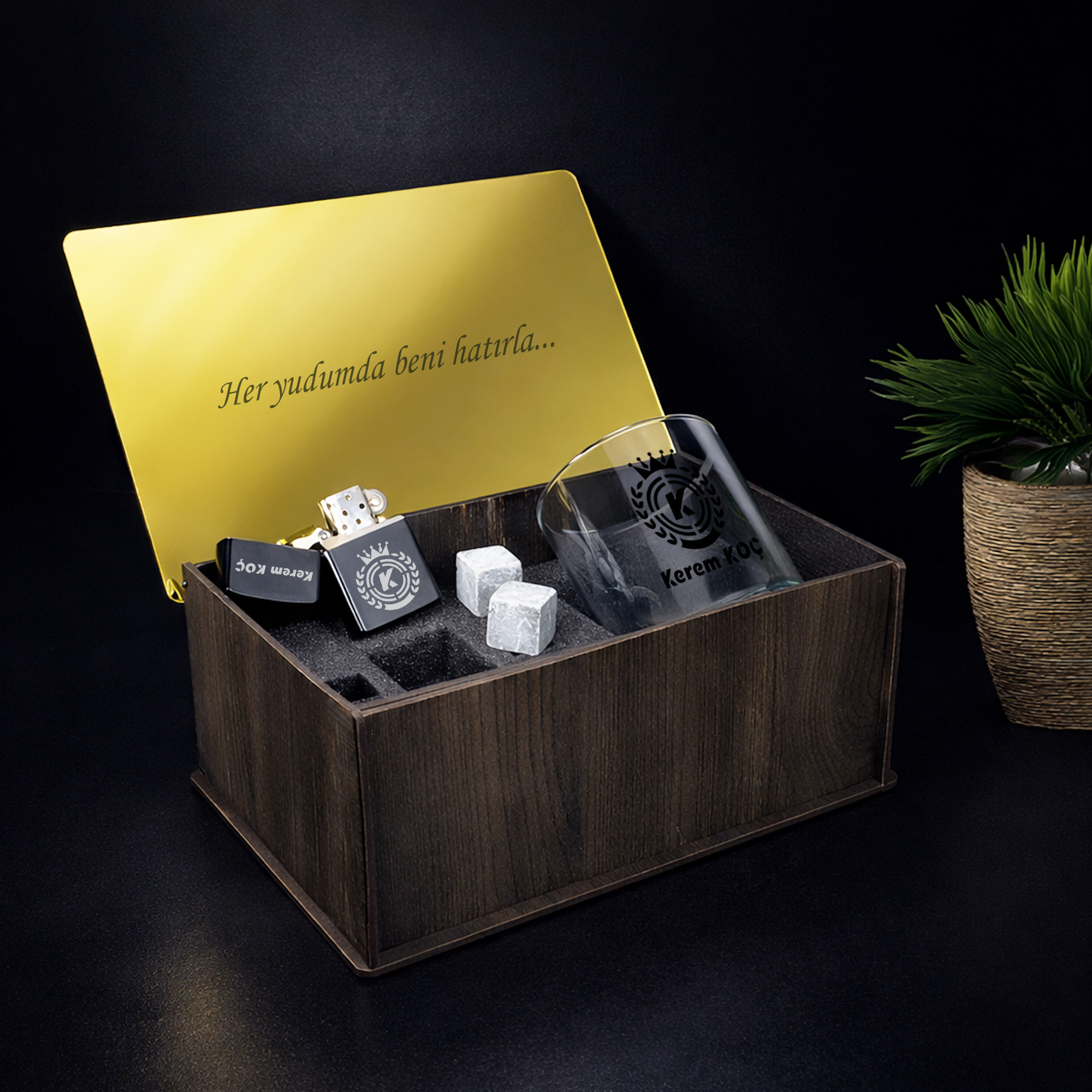 Ahşap hediye kutusu üzerinde yer alan altın renkli isim ve arma işlemesi, sete prestijli bir karakter kazandırır.