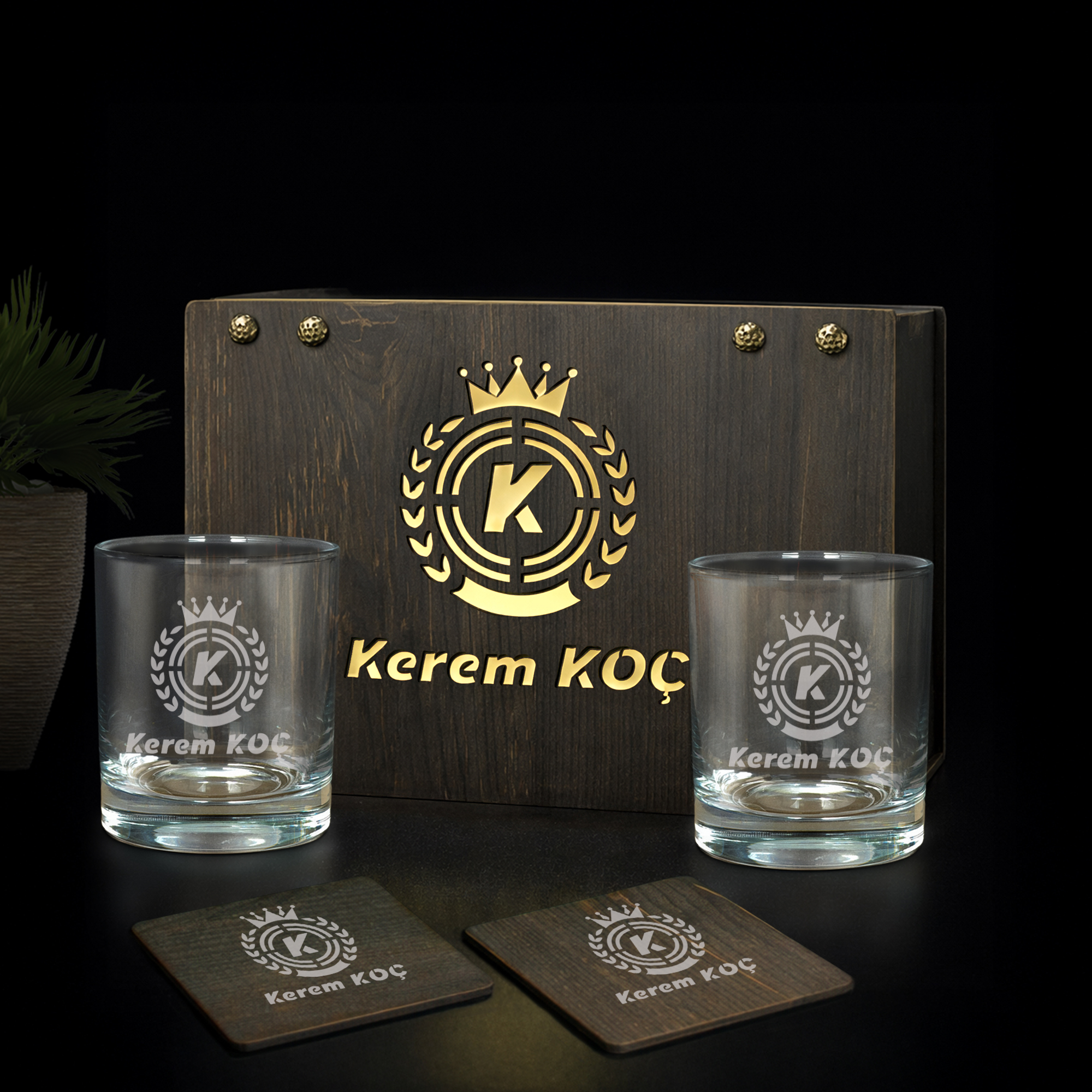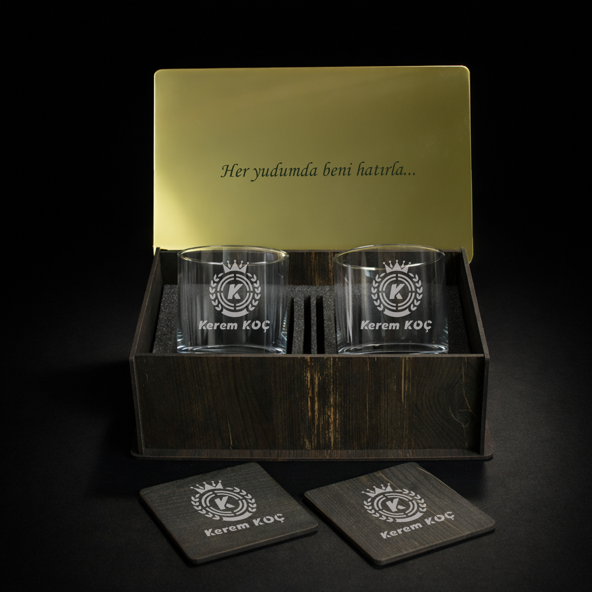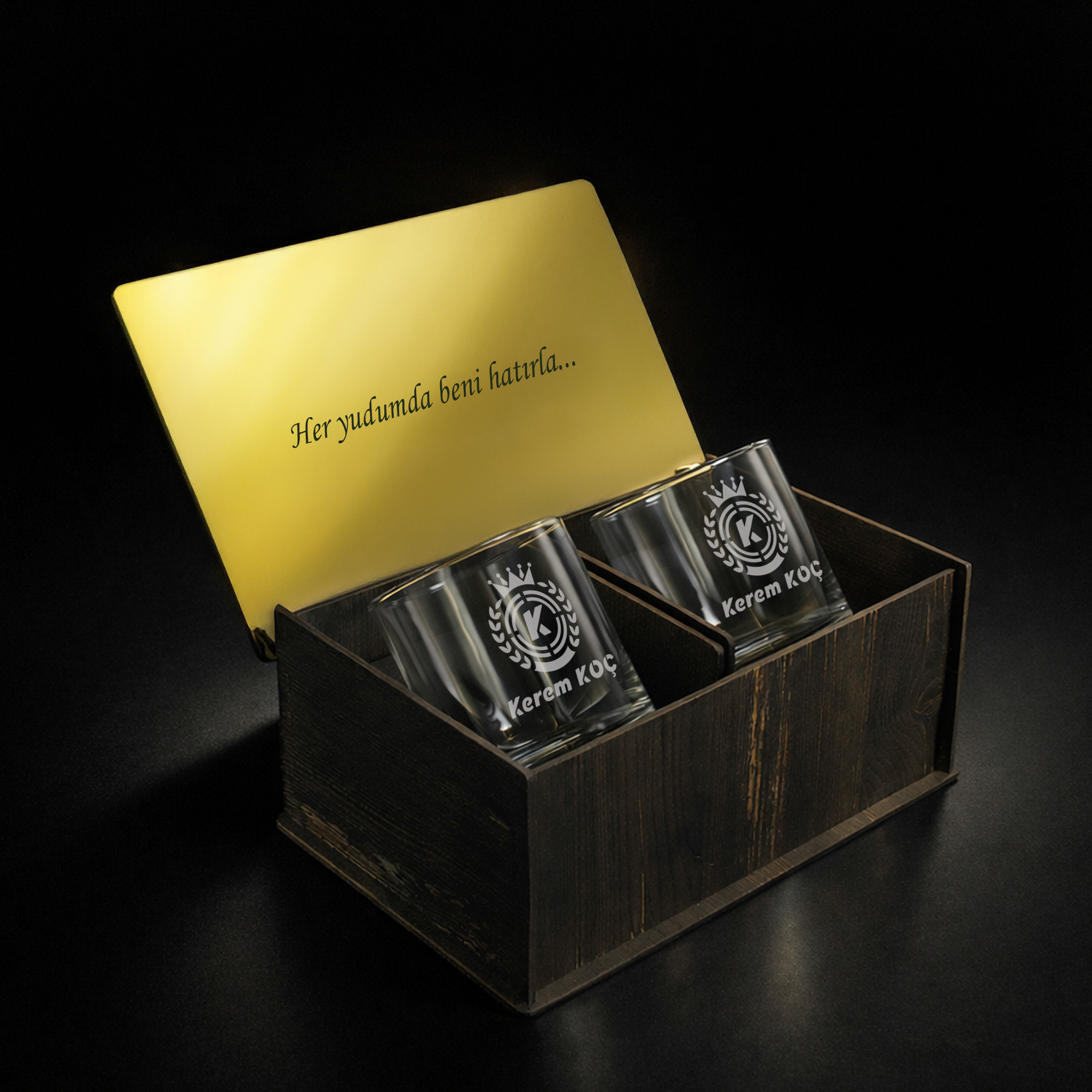 Ahşap kutunun ön yüzeyinde yer alan altın renkli logo ve isim detayı, sete prestijli bir görünüm kazandırır. Kutu kapağının iç kısmında yer alan altın plaka ise hediyeye duygusal bir anlam katar. Bardaklar ve bardak altlıkları, kutu tasarımıyla uyumlu olacak şekilde kişiye özel olarak hazırlanır.